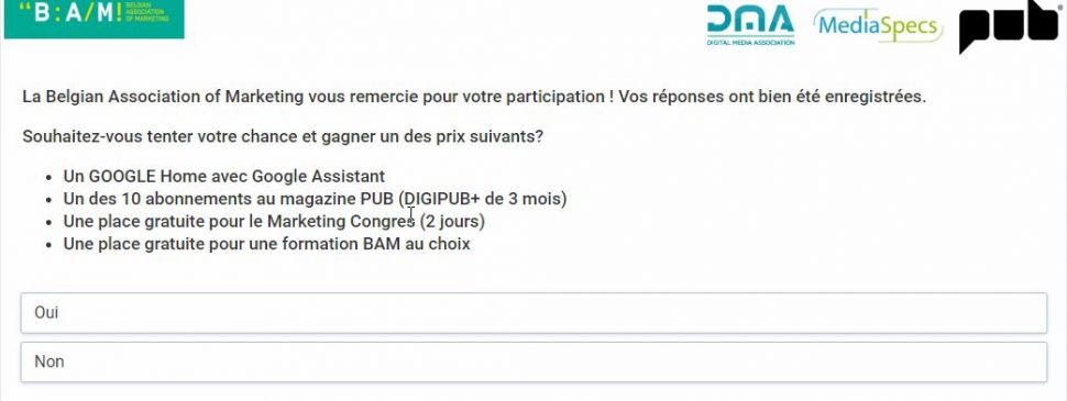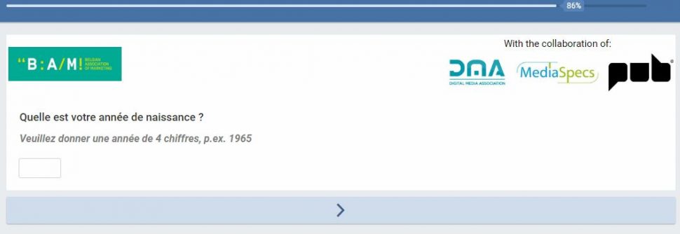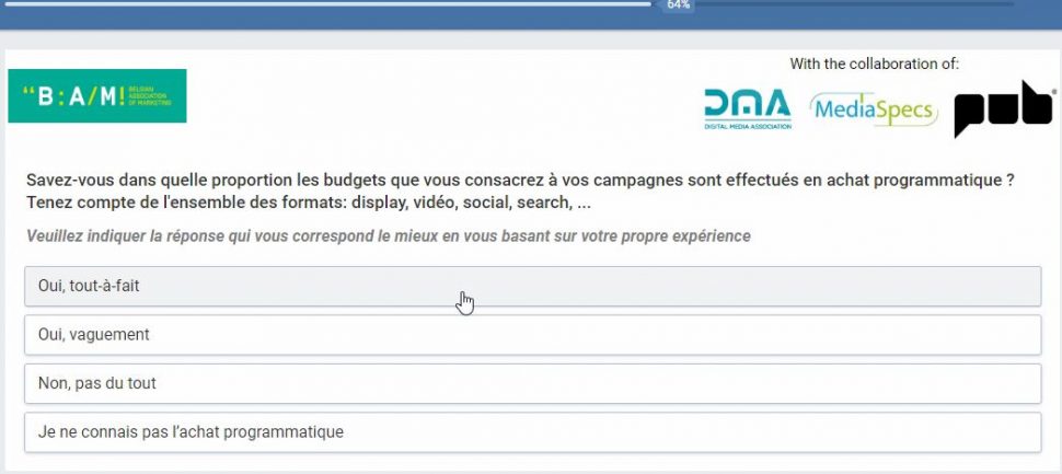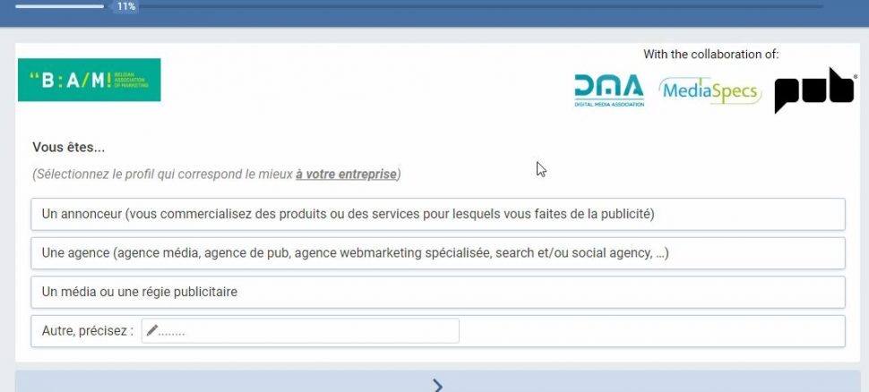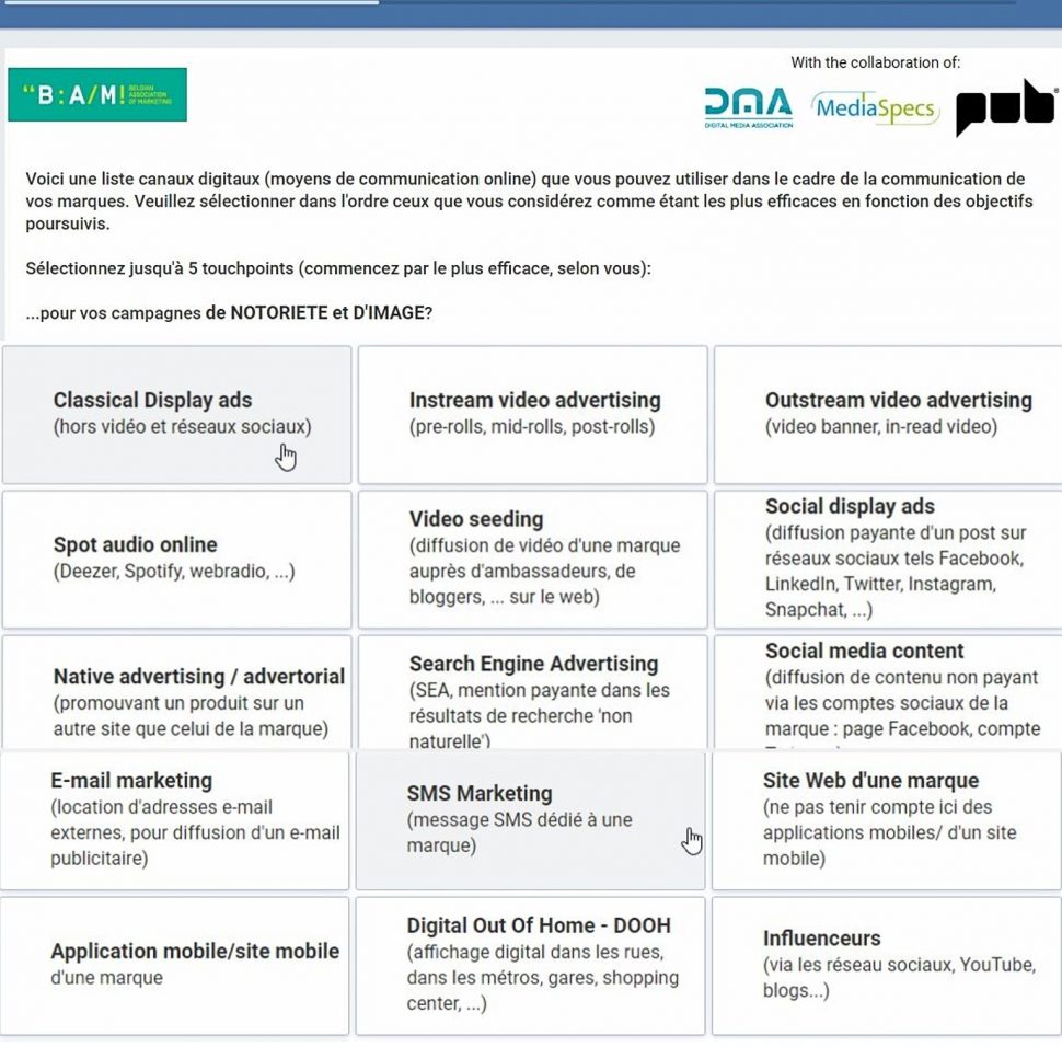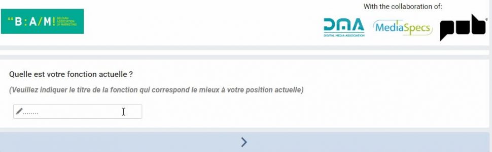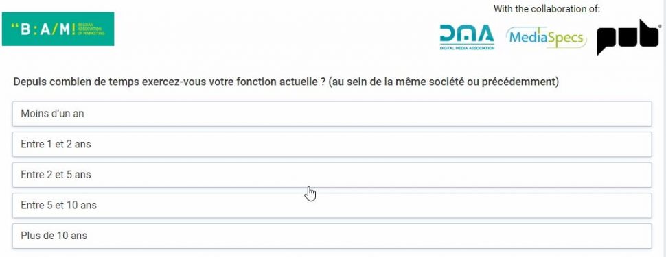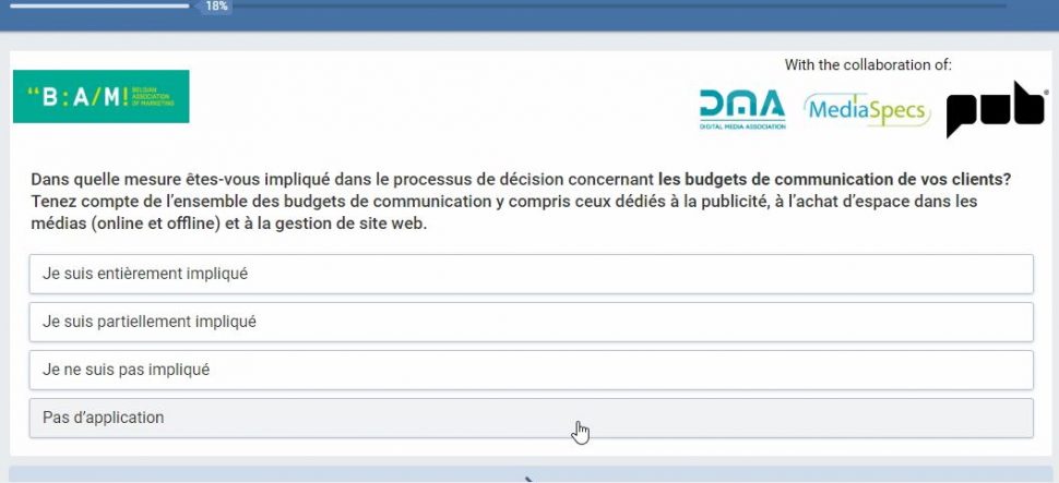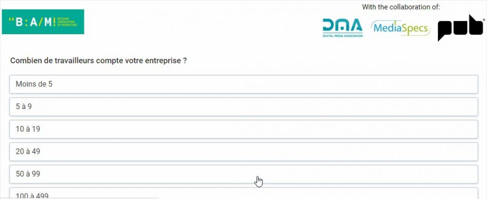 La BAM (Belgian Association of Marketing) diffuse cette enquête en collaboration avec la DMA (Digital Media Association), MediaSpecs et le magazine PUB. Le but est de collecter des informations relatives à l’utilisation des médias digitaux pas les entreprises dans leurs stratégies marketing et de communication. Le but est notamment de comprendre le degré d’allocation des budgets entre les communications online et offline mais également entre les différents médias digitaux, que ce soit pour l’entreprise elle-même ou ses clients (consulting).