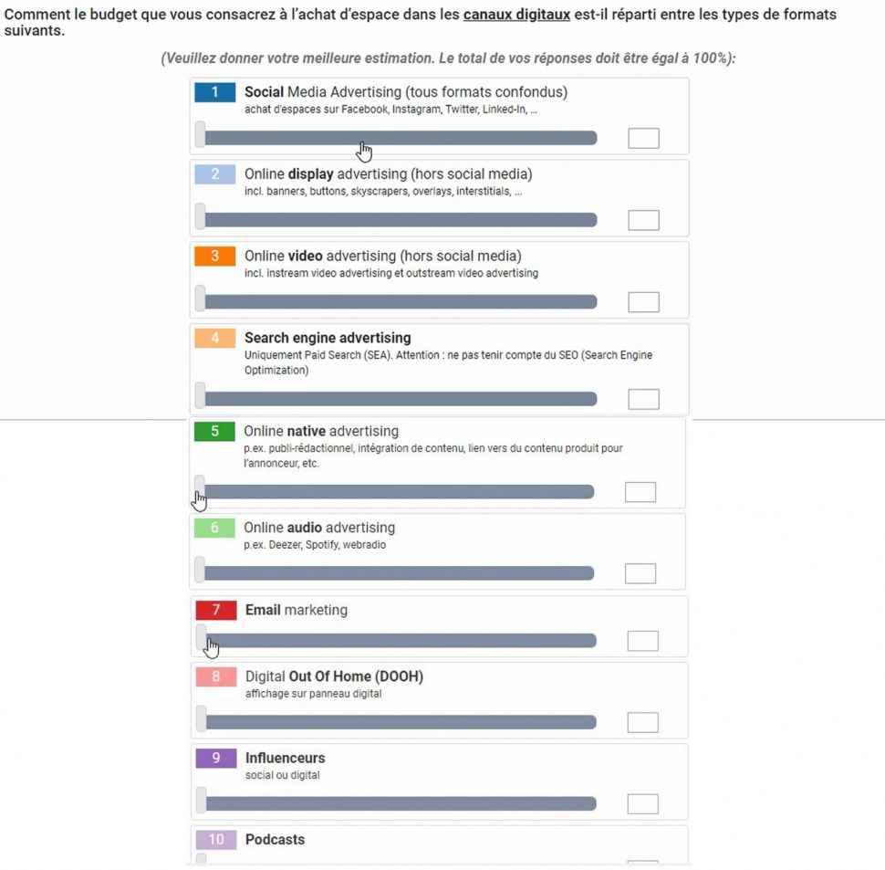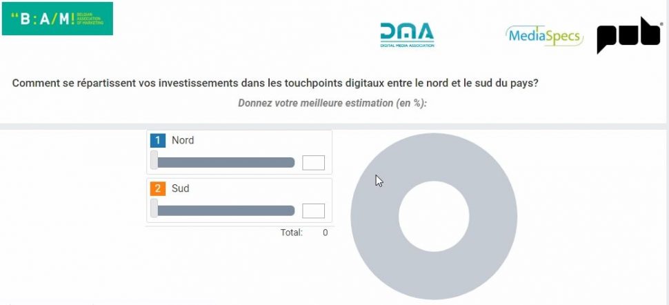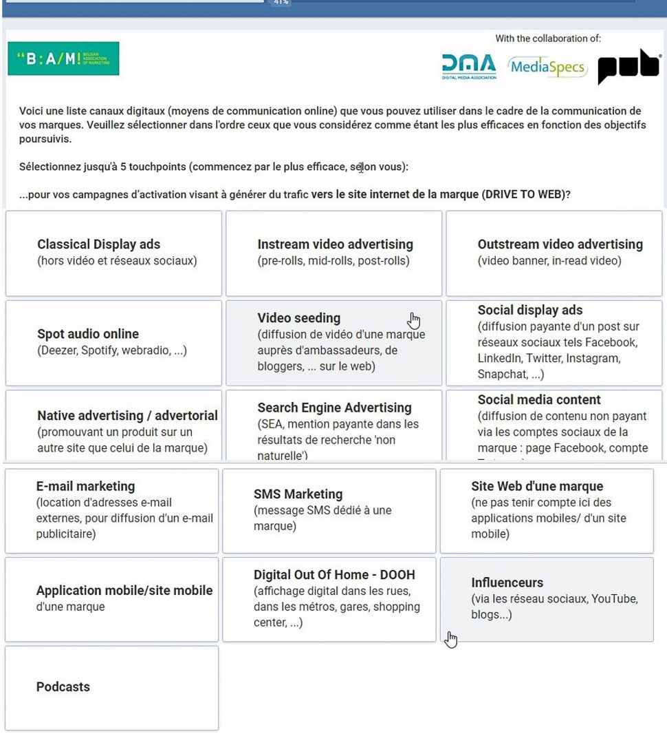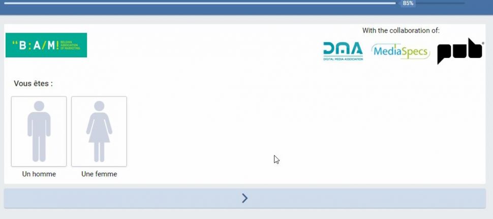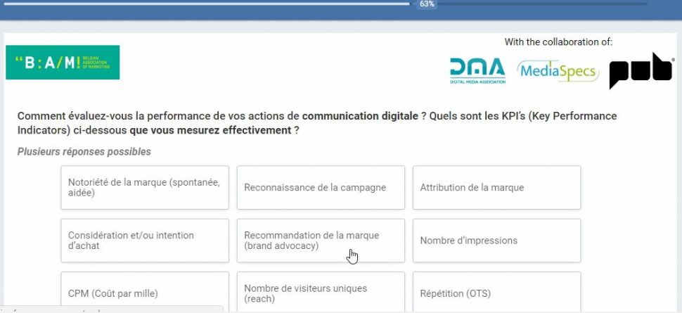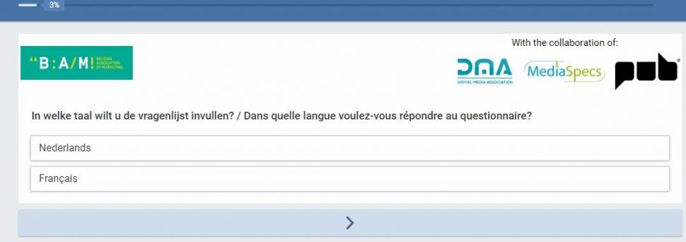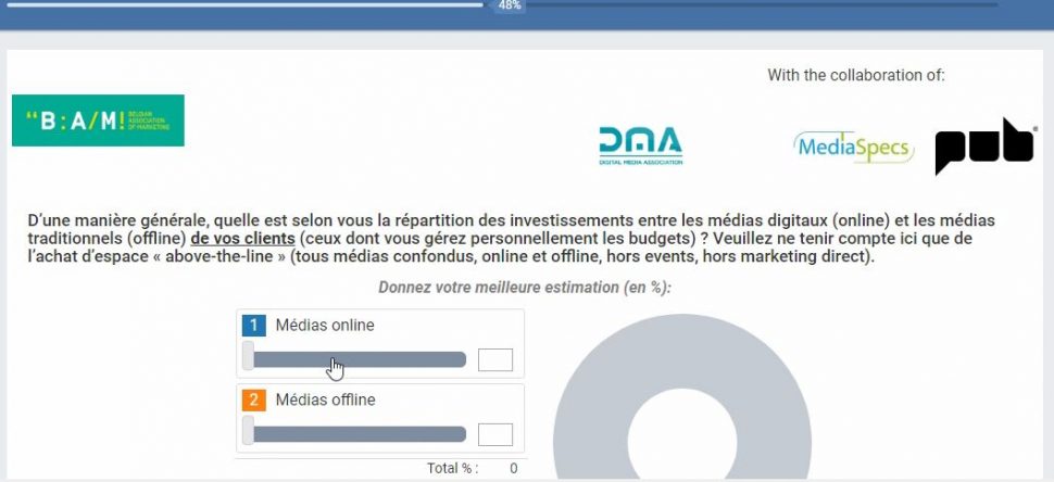 La BAM (Belgian Association of Marketing) diffuse cette enquête en collaboration avec la DMA (Digital Media Association), MediaSpecs et le magazine PUB. Le but est de collecter des informations relatives à l’utilisation des médias digitaux pas les entreprises dans leurs stratégies marketing et de communication. Le but est notamment de comprendre le degré d’allocation des budgets entre les communications online et offline mais également entre les différents médias digitaux, que ce soit pour l’entreprise elle-même ou ses clients (consulting).