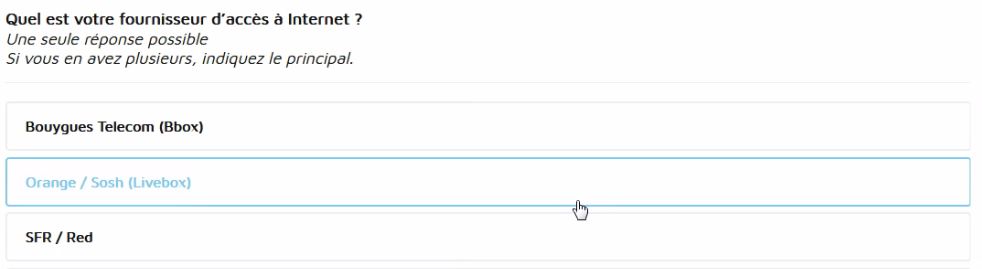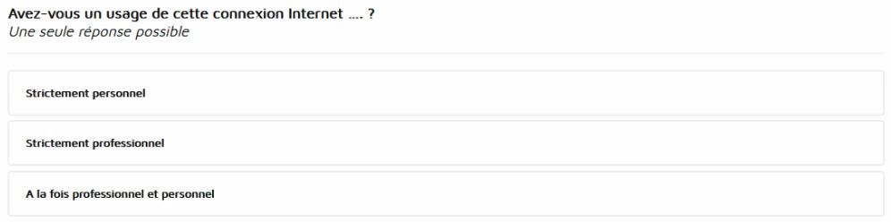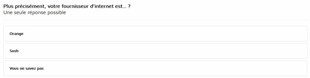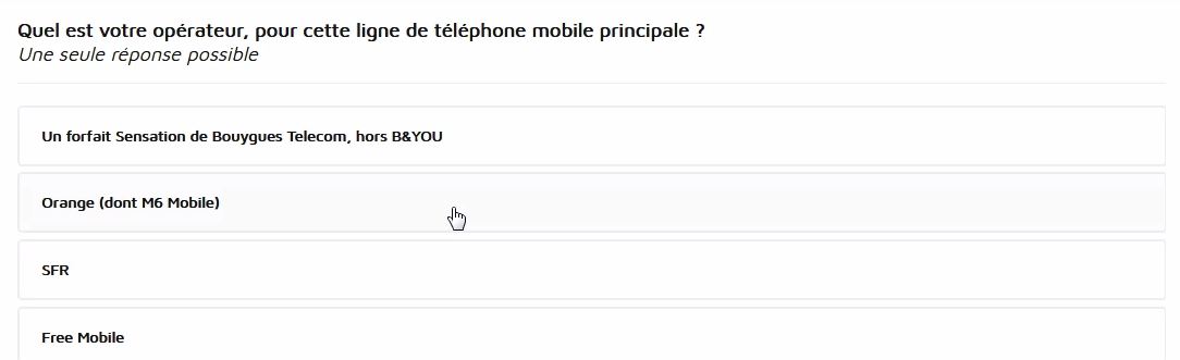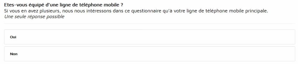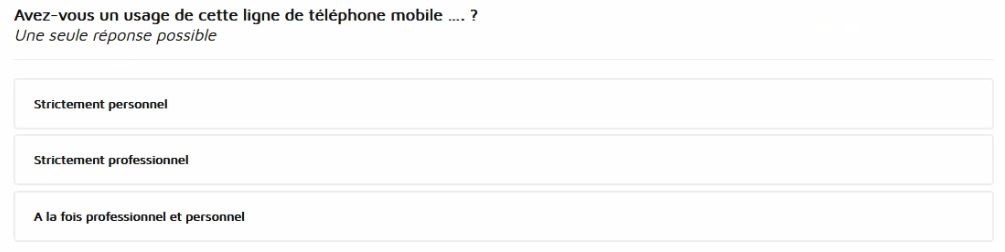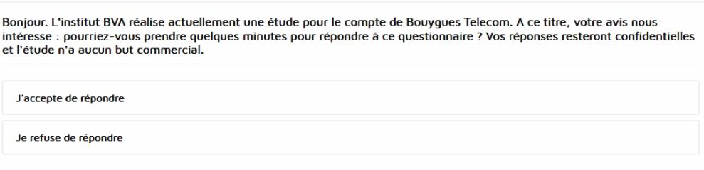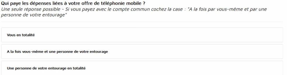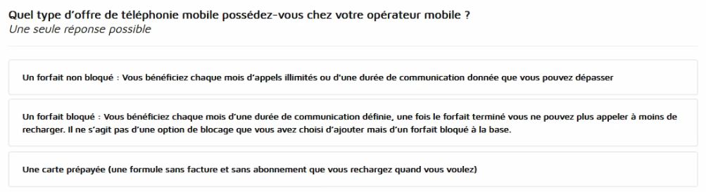Le questionnaire est assez court et a pour objectif premier de définir la conjoncture globale du marché télécom en France. Ce type de questionnaire peut être intéressant dans le cadre de la réalisation d’un marketing mix.