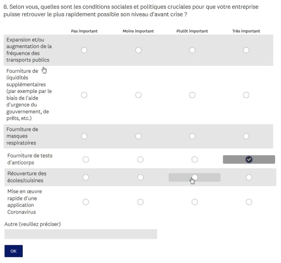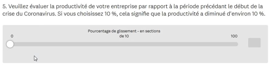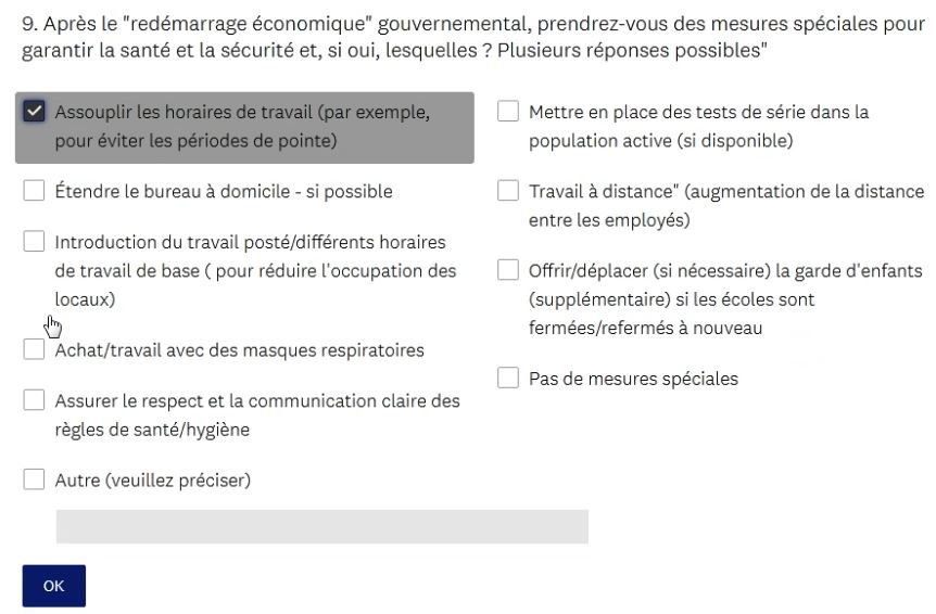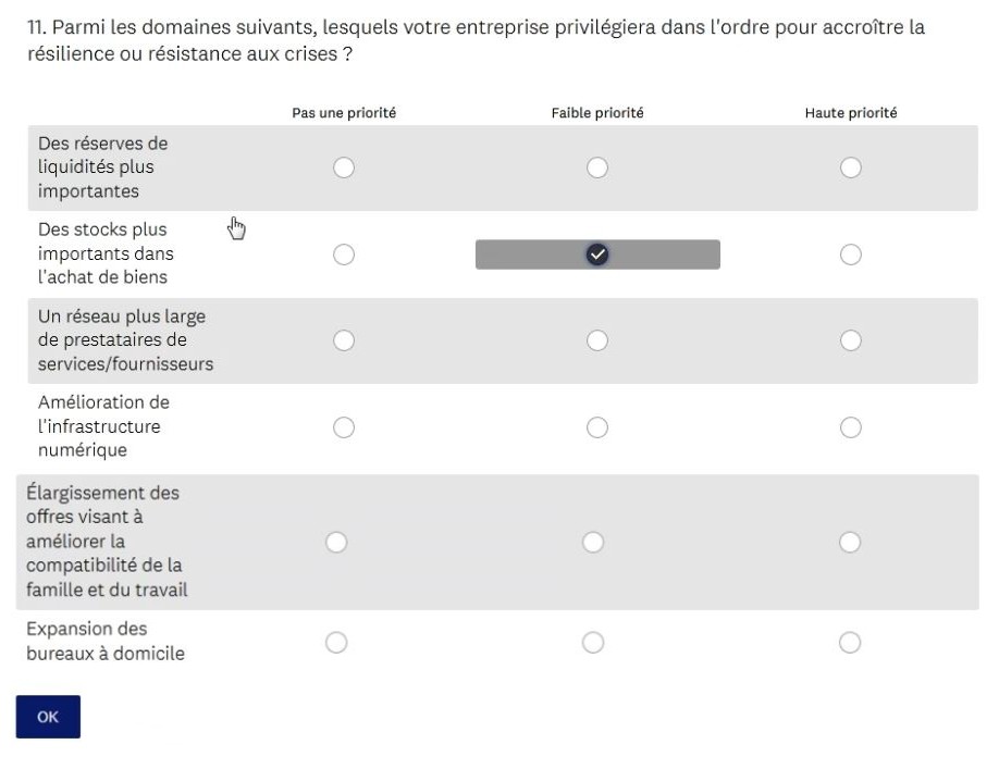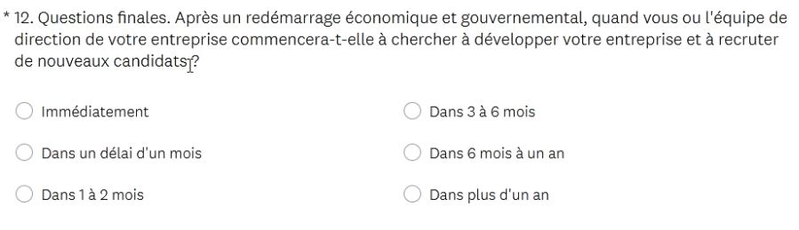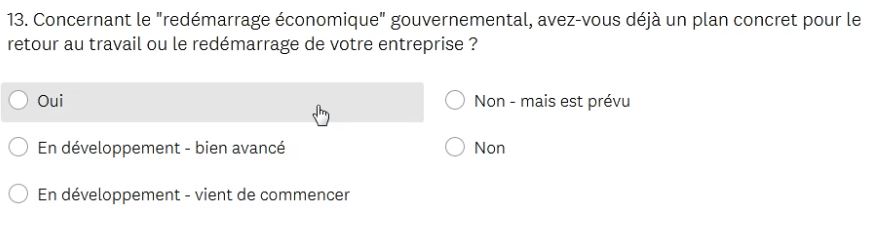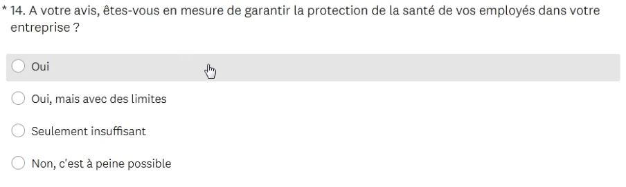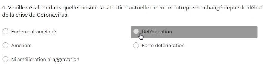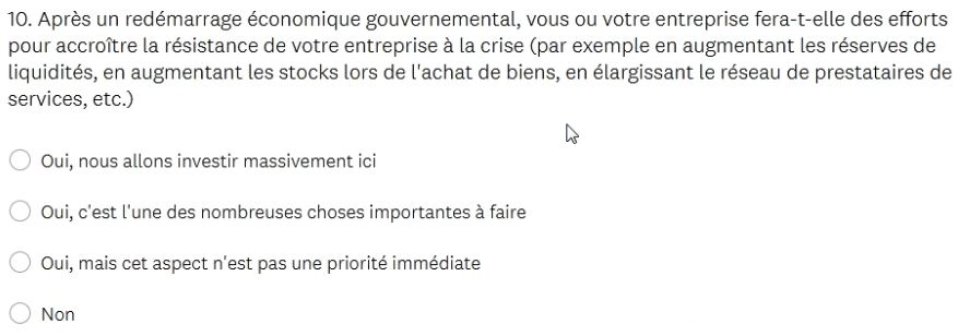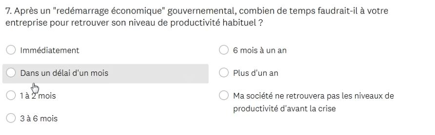 Chaque question propose un panel de réponses potentielles ayant pour but de dépeindre diverses situations d’entreprises. Cette enquête a pour objectif de comprendre les enjeux et challenges auxquels les entreprises doivent faire face dans cette situation de crise ainsi de définir les conséquences de cette dernière.